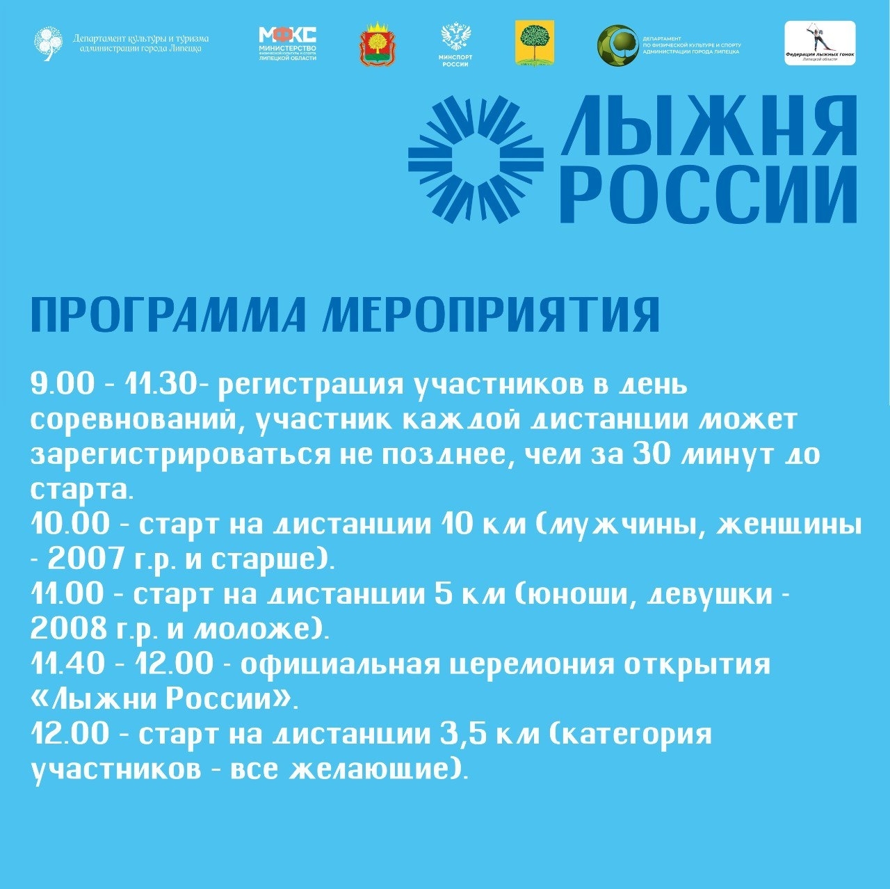 - основной массовый забег на 3,5 км (без учета времени) — для всех, кто хочет зарядиться эмоциями от атмосферы лыжных гонок.