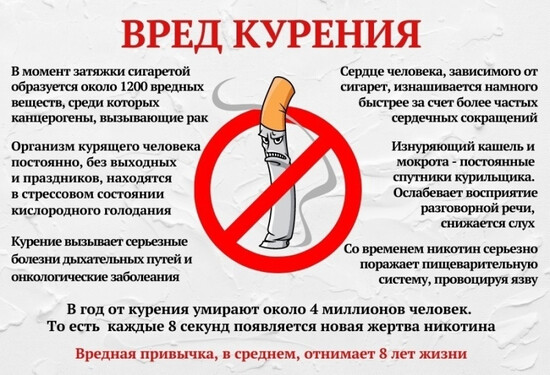 Курение вредно для подростков из-за физиологических особенностей ещё незрелого организма. Токсины табачного дыма действуют на подростков сильнее, чем на взрослого человека, поскольку тело ещё не до конца сформировано. |